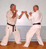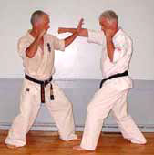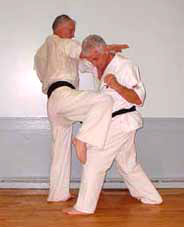 (shuto yoko ganmen uchi) to opponenet's temple or neck. Follow with a knee
