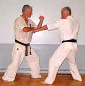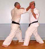 Block opponent's punches as shown, then deliver an open edge-of-hand strike